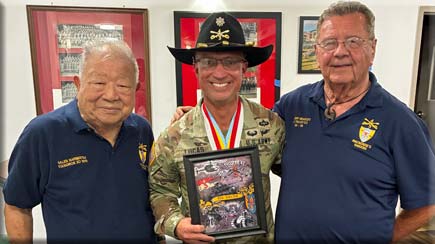 Squadron CO, LTC James Lucas, received the farewell gift from the 3/4 Cavalry Association during the squadron's deactivation ceremony. LTC Lucas is the final serving squadron cdr unless the squadron is reactivated at some point in the future. Making the presentation are Col. Galen NARIMATSU (ret) & Maj. Jerry Headley (ret). thanks John Moore