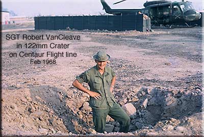 About 0200, while we were trying to get some Zs, we were awoken by huge white flashes accompanied by tremendous explosions. My first experience with the NVA and their 122mm rockets was just what they hoped for; something that would scare the crap out of us, put us on edge, and generally disrupt our lives. As those first rockets started to fall, we in the Centaurs who were not assigned to fly made a mad dash to trenches which were in the process of becoming bunkers, but now were merely holes in the ground. We lay there, covering up as best we could, listening to a sound that in the next few weeks become all too familiar; the WHOOSH of the incoming rockets, followed by the deafening explosion and flash that made night into day for a millisecond. The enemy was evidently targeting the flight line and runway, and since we lived on the flight line, our area was nailed by the rocketeers. As the rockets came in, it became easy to judge when they were going to land close or pass us by, and as the close ones were about to hit, we hugged mother earth and hoped/prayed that it wouldn't be the last thing that we ever heard. The initial attack was over in a few minutes, and then, giving us a while to think that maybe it was over, another barrage ensued. By the second attack, I was in flak jacket and pisspot, but hearing the intensity of the explosions, there was little comfort in wearing such protection. As yet, I had not seen the crater that a 122 left. When I did, in our troop area and in the Corral after first light, it was obvious that if you were anywhere near the point of impact you could kiss your ass goodbye. All of a sudden, mortar attacks seemed almost fun in comparison to rockets.